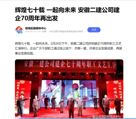 輝煌七十載,一起向未來。2月24日下午,安徽二建公司慶祝建企70周年職工文藝匯演舉行。企業(yè)廣大干部職工通過線上線下,齊聚一堂,共享企業(yè)發(fā)展成果,再展事業(yè)發(fā)展宏圖。