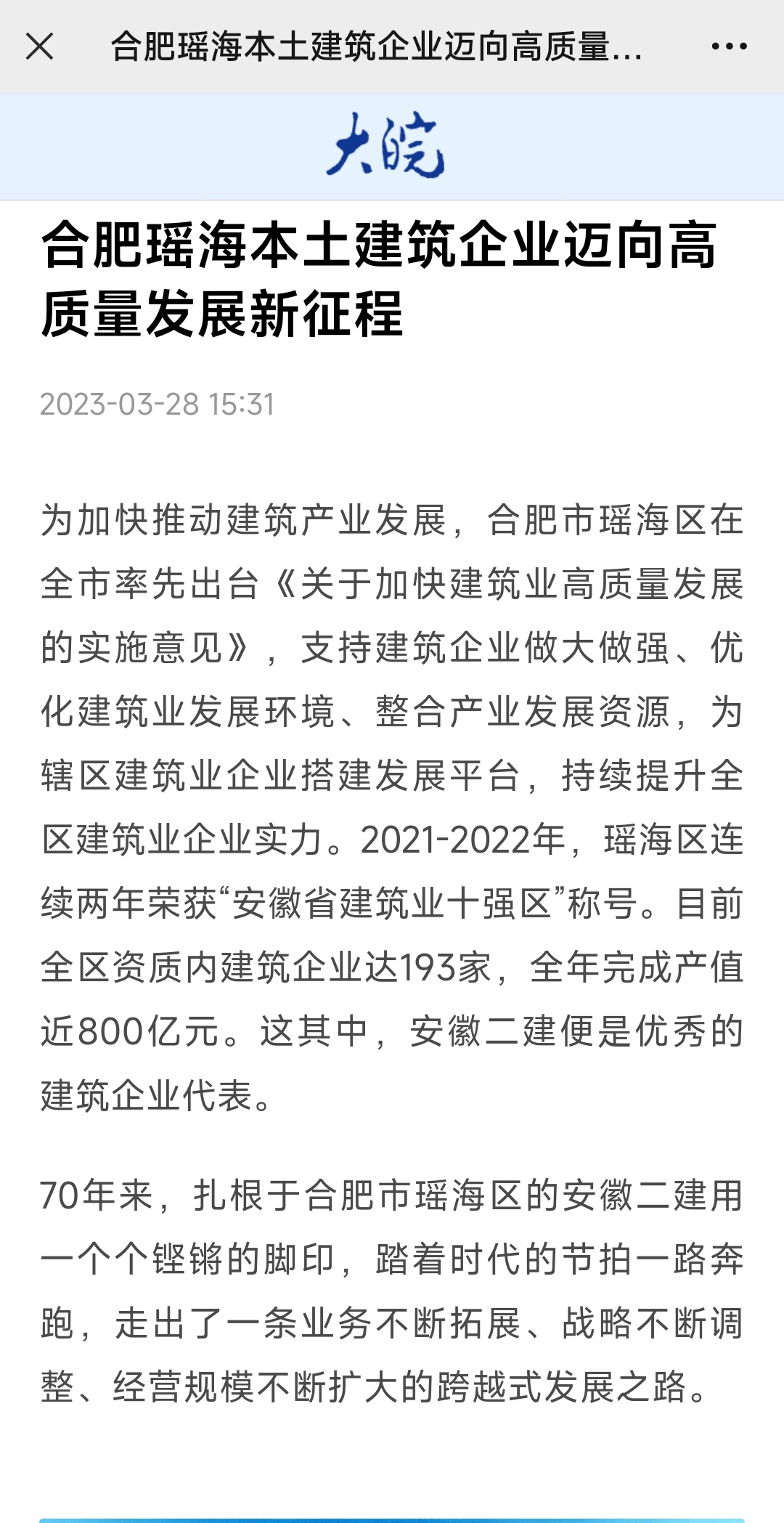 3月28日,人民網(wǎng)安徽頻道、中國網(wǎng)韻動安徽、中國日報網(wǎng)、安徽日報、大皖新聞、瑤海發(fā)布等權(quán)威主流媒體相繼報道安徽二建公司建企70周年發(fā)展成就,滿懷信心邁向高質(zhì)量發(fā)展新征程。
