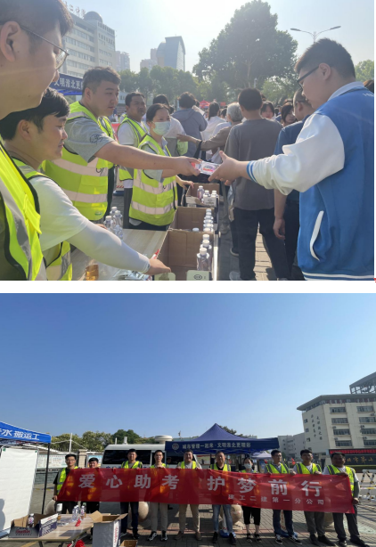 “中考加油”“旗開(kāi)得勝!”青年志愿者正在為夏日炎炎下等待入場(chǎng)的中考考生送上助考物資和祝福。紫郡府項(xiàng)目部在淮北市中考考點(diǎn)設(shè)“愛(ài)心送考”服務(wù)臺(tái),為中考學(xué)子提供礦泉水、應(yīng)急文具用品等,提醒考生們檢查準(zhǔn)考證、身份證等考試必備用品。