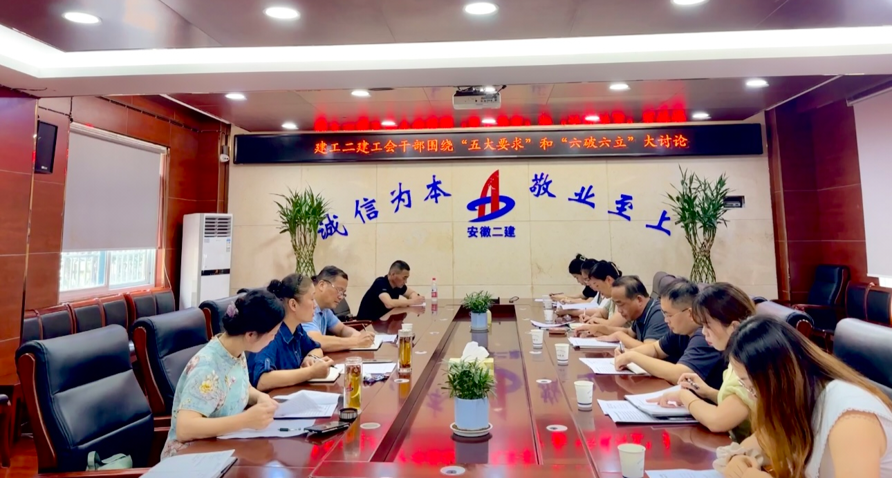 8月18日下午,建工二建工會干部圍繞“思想大解放、環(huán)境大優(yōu)化、能力大提升、作風(fēng)大轉(zhuǎn)變、任務(wù)大落實”和“六破六立”開展大討論。工會副主席、女工委主任王俊主持會議,公司工會工作人員、所屬各單位工會(副)主席、綜合辦工會干事參會。