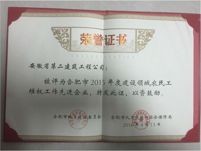 日前,在合肥市建委、合肥市人力資源和社會保障局聯(lián)合舉辦的合肥市2015年度建設(shè)領(lǐng)域農(nóng)民工維權(quán)先進管理單位、先進企業(yè)和先進個人的評比表彰活動中,我公司被授予“建設(shè)領(lǐng)域農(nóng)民工維權(quán)工作先進企業(yè)”稱號
