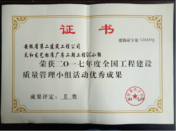 6月27—30日,安徽二建四分公司太和發(fā)藝標(biāo)準(zhǔn)廠房二期工程QC小組參加了由中國建筑業(yè)協(xié)會在四川成都主辦的全國工程建設(shè)優(yōu)秀質(zhì)量管理小組活動成果交流會。經(jīng)過激烈的評比,太和發(fā)藝標(biāo)準(zhǔn)廠房二期工程QC小組《提高混凝土框架柱觀感質(zhì)量合格率》憑借著“高標(biāo)準(zhǔn)、嚴(yán)要求”的技術(shù)管控榮獲2017年度全國工程建設(shè)優(yōu)秀QC成果二等獎。