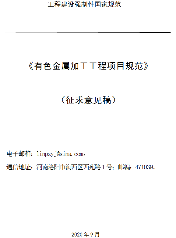 《有色金屬加工工程項(xiàng)目規(guī)范(征求意見稿)》