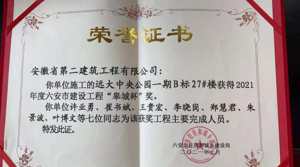 近期,六安市住房和城鄉(xiāng)建設(shè)局公布了2021年度六安市建設(shè)工程“皋城杯”獲獎項目名單,其中由安徽二建公司承建的舒城遠大項目獲此獎項。