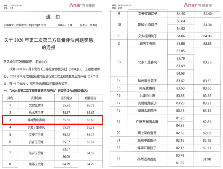 本次檢測(cè)涉及33個(gè)項(xiàng)目、46個(gè)標(biāo)段、39家施工單位,檢測(cè)方采用隨機(jī)抽取的辦法,按照統(tǒng)一標(biāo)準(zhǔn)、統(tǒng)一尺度進(jìn)行檢測(cè),檢測(cè)數(shù)據(jù)實(shí)時(shí)上傳,確保檢測(cè)結(jié)果公平公正,評(píng)估分為工程質(zhì)量實(shí)測(cè)實(shí)量、混凝土檢測(cè)、安全文明施工、質(zhì)量風(fēng)險(xiǎn)防控四個(gè)部分,檢測(cè)結(jié)果如實(shí)反映各工程的實(shí)際施工質(zhì)量水平。安徽二建公司承建的蚌埠湖山春曉項(xiàng)目在檢測(cè)中綜合得分85.66分,位列第三名,受到建設(shè)單位的通報(bào)表?yè)P(yáng)和獎(jiǎng)勵(lì),為公司贏得了社會(huì)信譽(yù),同時(shí)也為石榴集團(tuán)下一步合作奠定了堅(jiān)實(shí)基礎(chǔ)。