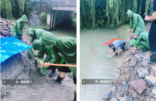 一分公司文一·塘溪津門項目全體人員積極響應(yīng)公司及建設(shè)單位的號召,立即展開了一系列的抗洪搶險工作。針對D-09-04地塊金斗公園內(nèi)部河道漫水至工地影響現(xiàn)場安全的情況,及時在河道漫水區(qū)域堆放沙袋,封堵漫水口,保河堤戰(zhàn)洪水,抗洪搶險奮戰(zhàn)一線。