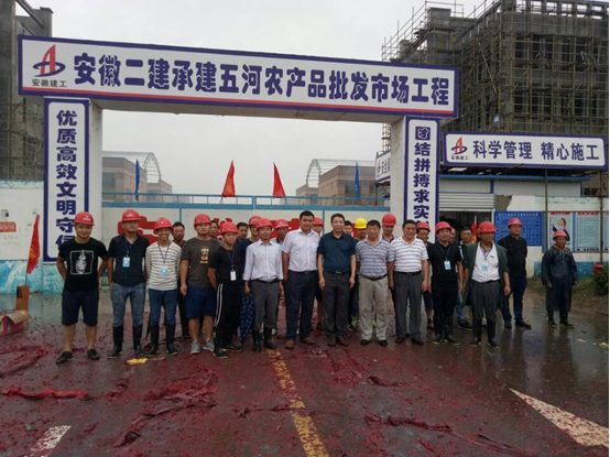 8月29日上午,條幅高懸,鞭炮齊鳴,在業(yè)主、監(jiān)理單位及安徽二建公司領(lǐng)導(dǎo)的共同見證下,由我公司承建的五河農(nóng)產(chǎn)品批發(fā)市場一期項目主體結(jié)構(gòu)順利封頂。