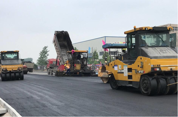 2017年5月3日上午9:58,安徽二建太和市政道路項(xiàng)目現(xiàn)場(chǎng)彩旗飄揚(yáng)、機(jī)器轟鳴,攤鋪機(jī)、壓路機(jī)、運(yùn)料車(chē)等各種機(jī)械設(shè)備有條不紊地進(jìn)行著瀝青路面試驗(yàn)段施工。